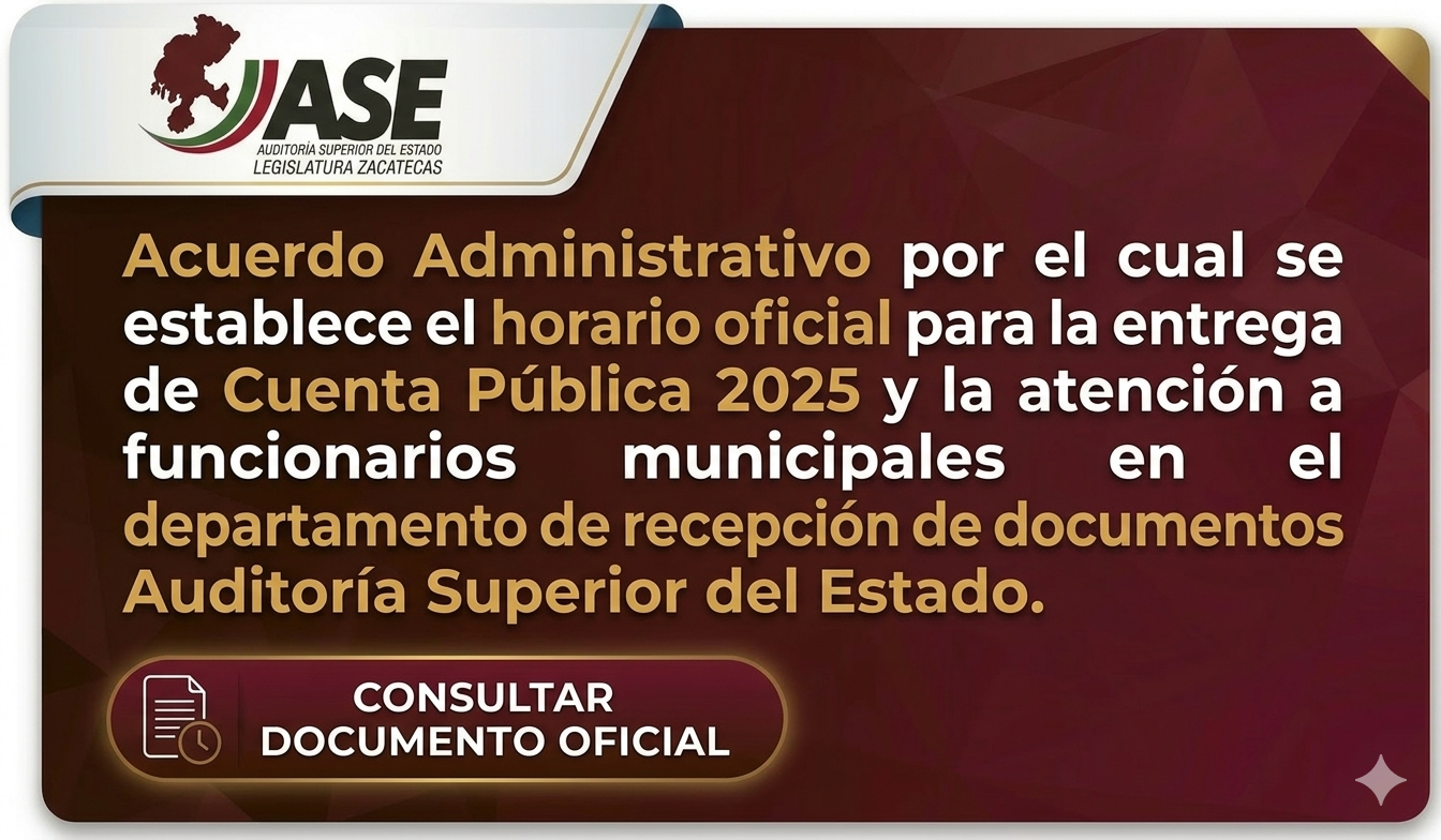 ACUERDO ADMINISTRATIVO NÚMERO 4 POR EL QUE SE ESTABLECE LA SUSPENSIÓN DE LABORES POR DÍA INHÁBIL DE LA AUDITORÍA SUPERIOR DEL ESTADO DE ZACATECAS, EJERCICIO FISCAL 202512/09/2025ACUERDO ADMINISTRATIVO NÚMERO 4 POR EL QUE SE ESTABLECE LA SUSPENSIÓN DE LABORES POR DÍA INHÁBIL DE LA AUDITORÍA SUPERIOR DEL ESTADO DE ZACATECAS, EJERCICIO FISCAL 2025 |